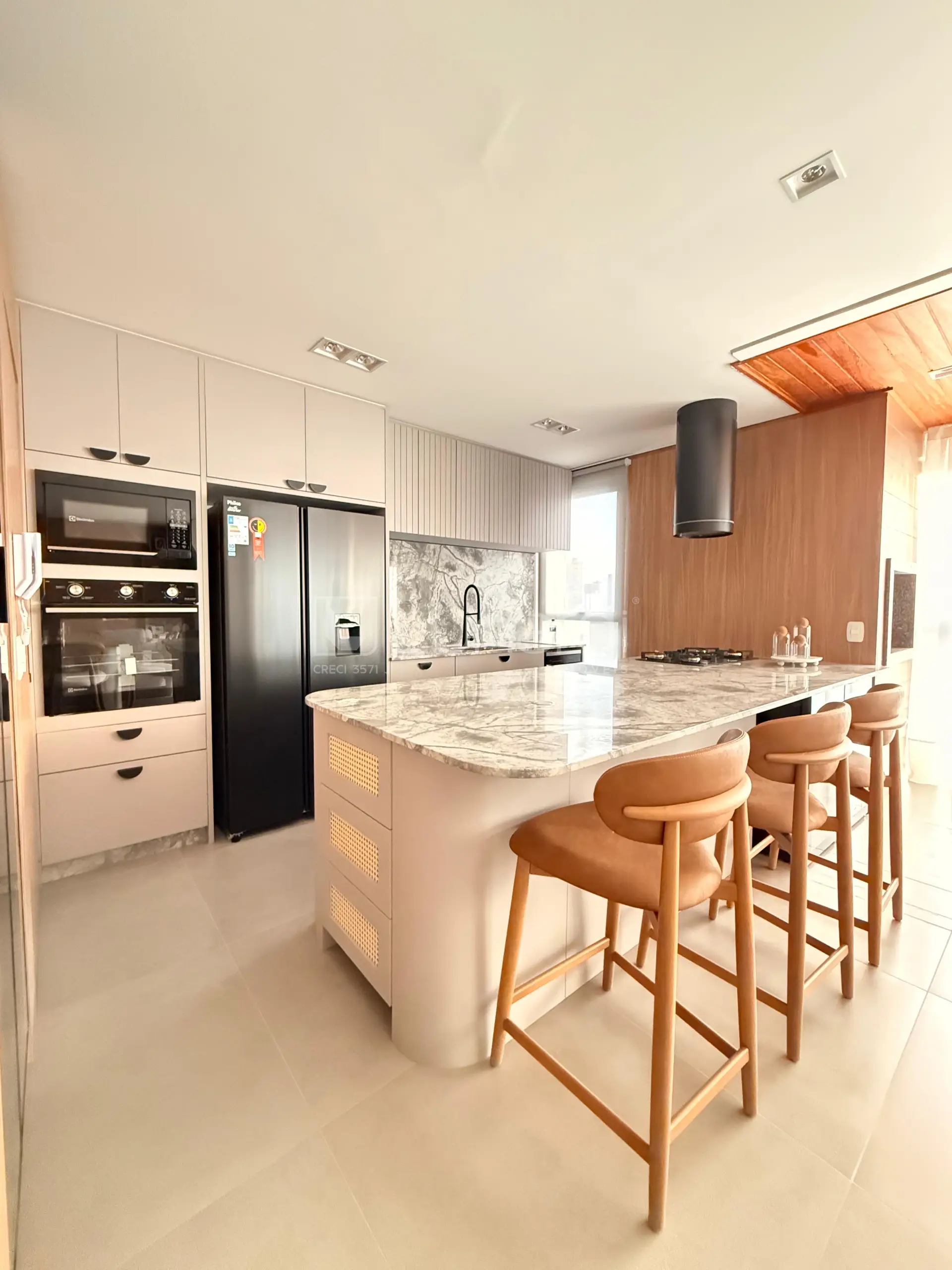 Com 134 m², são 3 dormitórios, incluindo uma suíte, e 2 demi suítes . O imóvel é mobiliado e conta com uma sala de estar, sacada com churrasqueira e cozinha planejada.