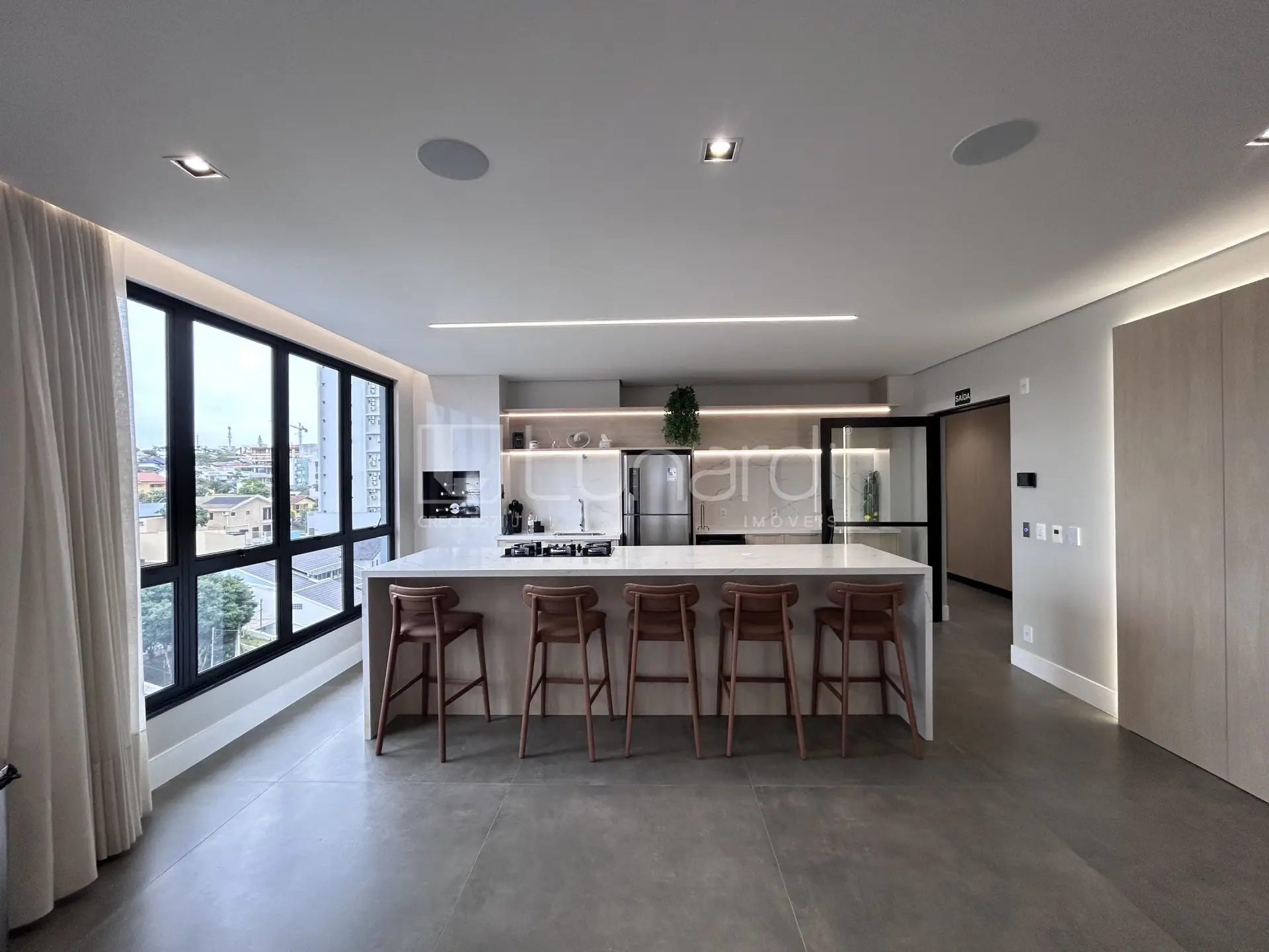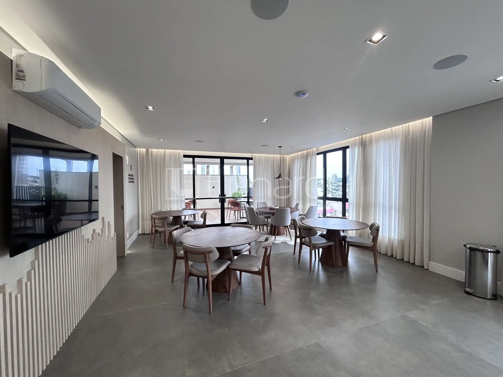 O condomínio oferece área de serviço, churrasqueira e confortáveis salas de jantar e TV.