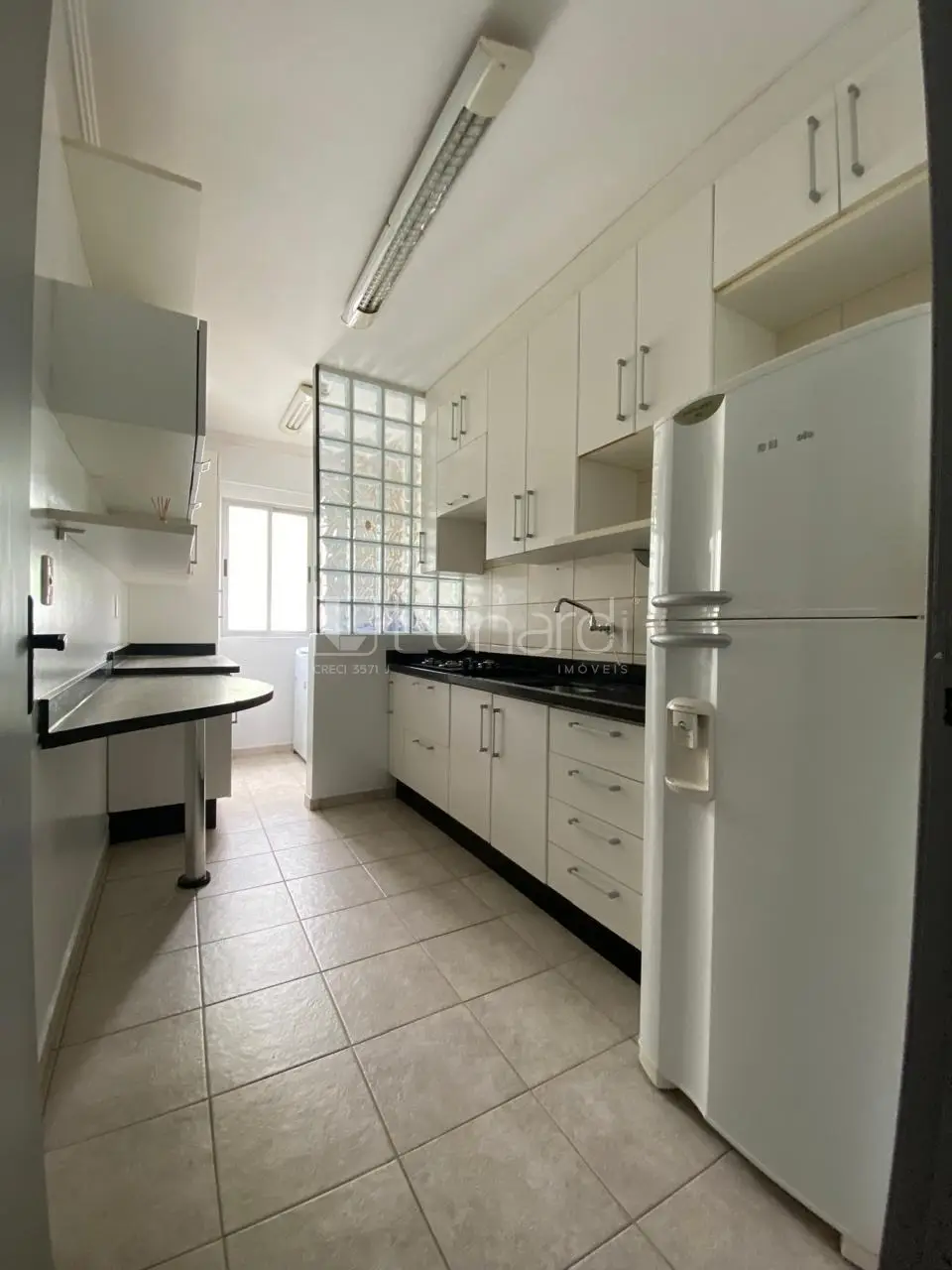 Cozinha com Móveis sob-medida, Bancada de Granito, Geladeira.