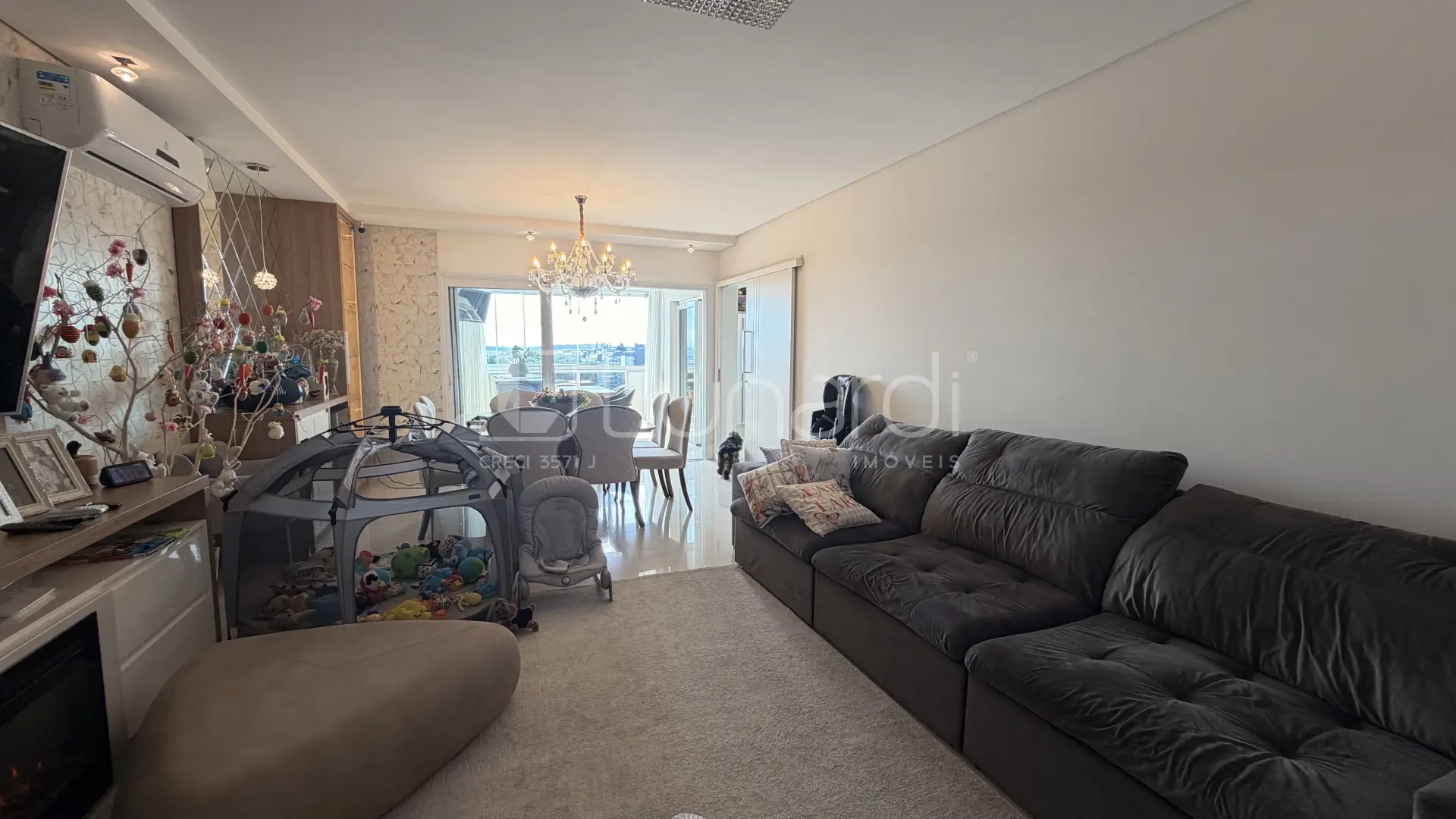 Relaxe na sala de estar com lareira, aproveite a sacada com churrasqueira e a vista panorâmica.