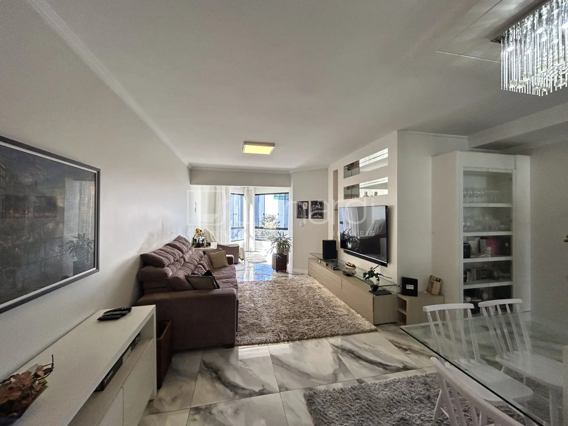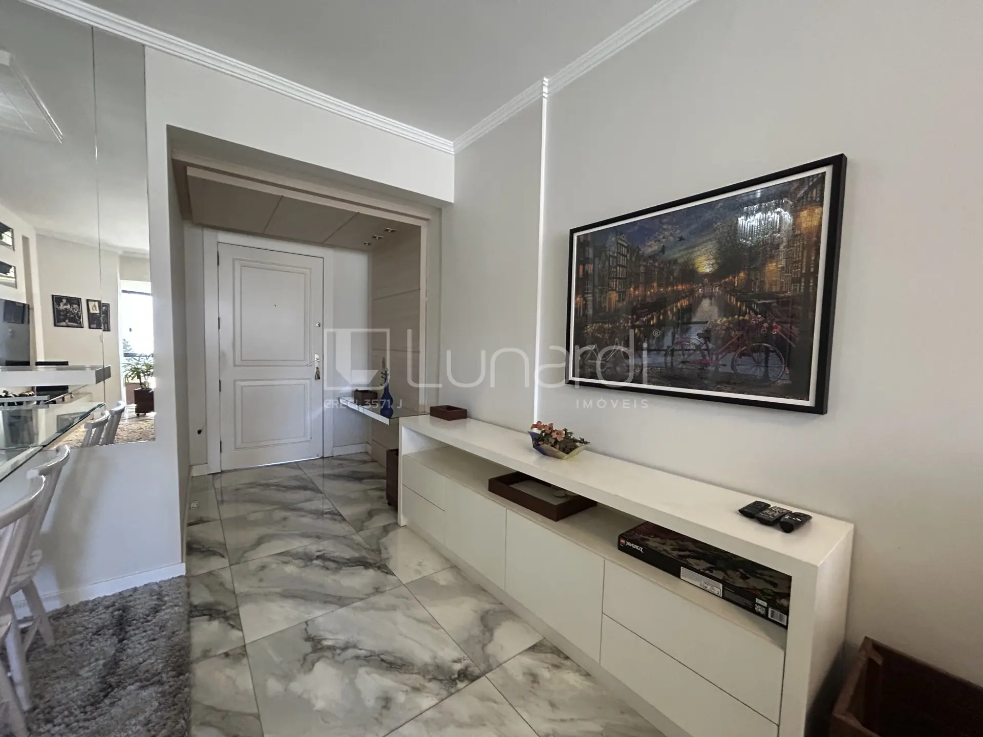 O imóvel possui suite master, mais dois dormitórios e um escritório, sala de estar e jantar, e um ambiente semi mobiliado, ideal para personalização.