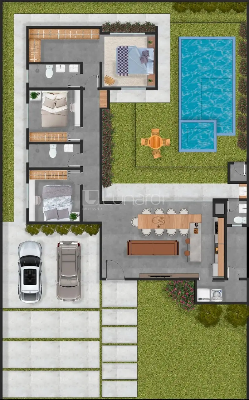Com uma área total de 360 m² e 170 m² de área privativa, esta residência possui 3 dormitórios, sendo 1 suíte master, e 1 banheiro social.
